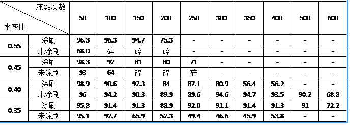 4.技术指标 (1)快冻法:混凝土抗冻不合格的解决方案 表三 混凝土动弹性模量对比